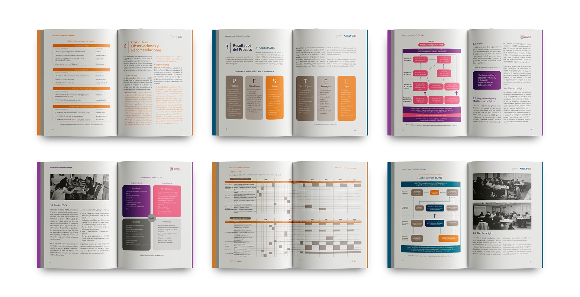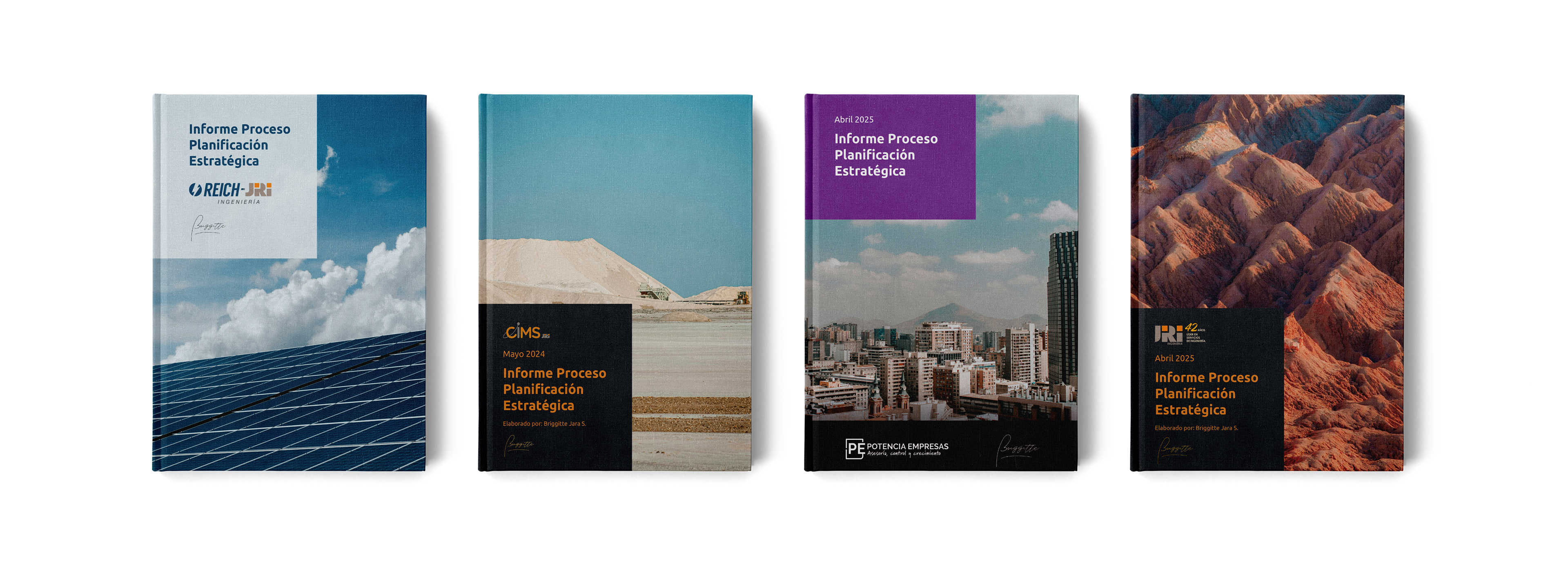 Editorial design for corporate strategic planning reports in collaboration with Briggitte Jara, strategic coach. The challenge was to transform complex information into clear, cohesive, and visually engaging documents with a professional and refined identity.